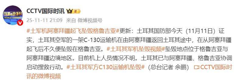 据CCTV国际时讯:土耳其国防部今天(11月11日)证实,土耳其空军的一架C-130运输机在由阿塞拜疆返回土耳其途中,在从阿塞拜疆起飞后不久便坠毁在格鲁吉亚。坠毁地点位于格鲁吉亚与阿塞拜疆边境地区。目前机上人员情况不明。